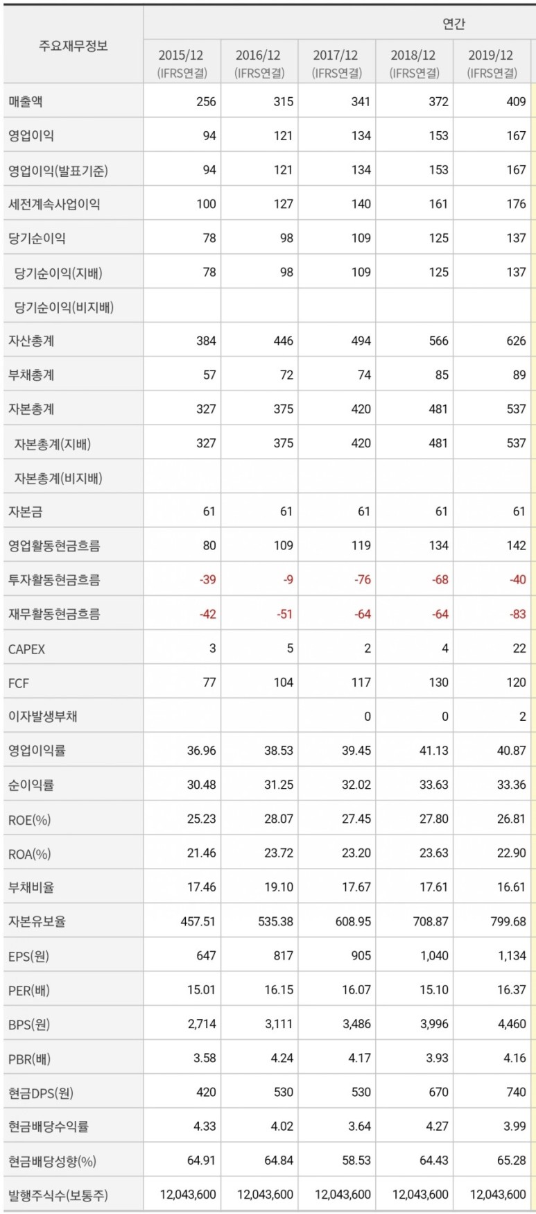아래 재무재표를 보시면 꾸준한 매출, 영업이익, 당기순이익 모두 증가하고 있고 영업이익률, 순이익률, ROE가 정말 잘 나오는 기업이네요.