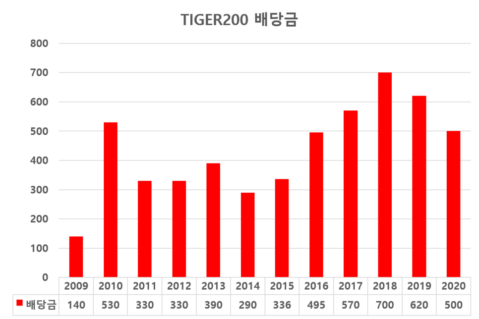 TIGER200은 코스피200을 추종하고 있기 때문에 코스피지수의 상승과 하락에 가장 영향을 많이 받는 ETF로 국내 주식시장의 성장을 함께 한다고 볼 수 있다. 물론 엄선되지 않은 기업이 모두 들어가 있기 때문에 S&P 500처럼 엄선된 지수와는 다르다.