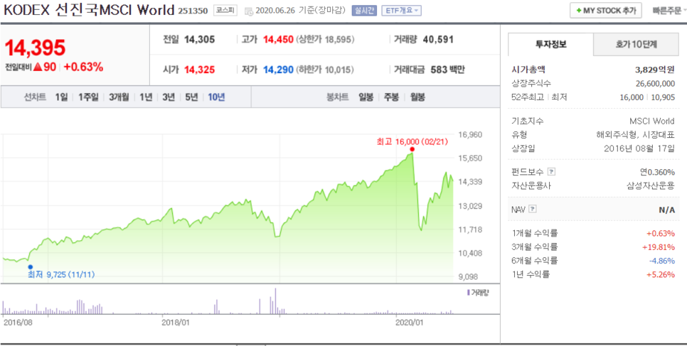 KODEX선진국MSCIWorld는 미국을 포함한 선진국에 상장된 기업 1,500개 이상을 묶어서 하나의 ETF로 만들었다. 많은 종목에 분산되어 있고 주당 가격이 저렴하기 때문에 모으기 좋다. 매달 큰 금액이 아니더라도 충분히 선진국 주식에 분산 투자하기 좋다는 말이다. 수수료도 0.35%로 크게 높지 않지 때문에 부담도 없다.