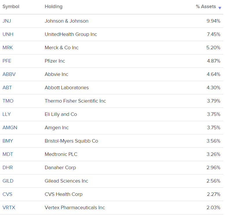 워워. 개별 기업으로 만 보면 엄청난데?? JNJ(존슨 앤 존슨), UNH(유나이티드 헬스그룹), MRK(머크), PFE(화이자), ABBV(애브비) 등등 맛집에 포함되어도 전혀 무색해 보인다.