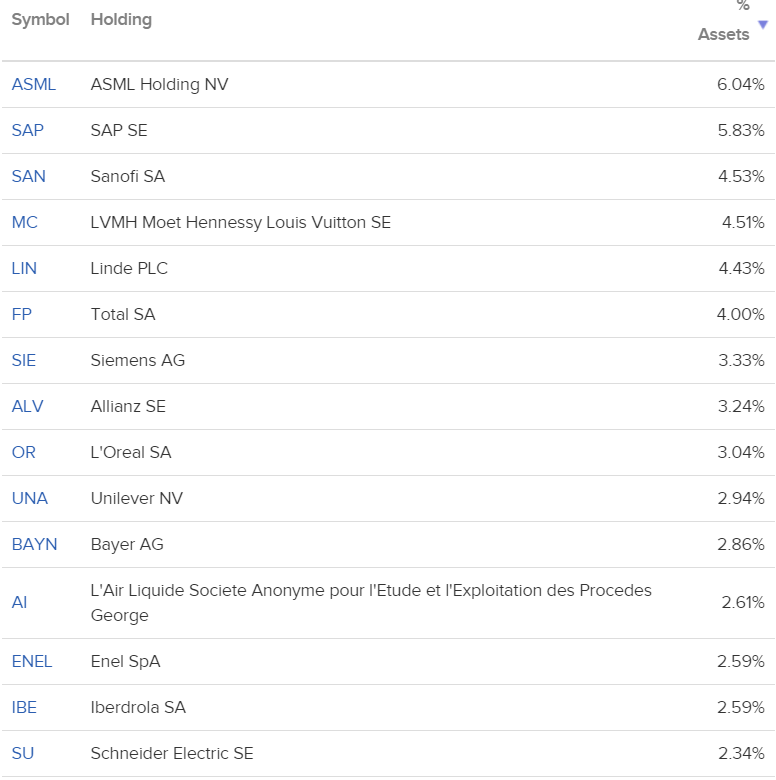 하지만 포트폴리오는 상당히 맘에 든다. 내가 좋아하는 ASML(ASML), SAN(사노피), MC(루이비통), SIE(지멘스), OR(로레알), UNA(유니레버), BAYN(바이엘)는 개별 주식으로도 모아가고 싶은 기업들이다.