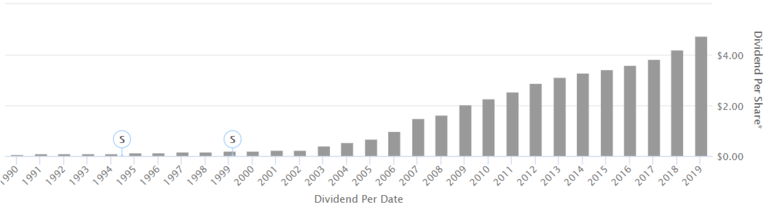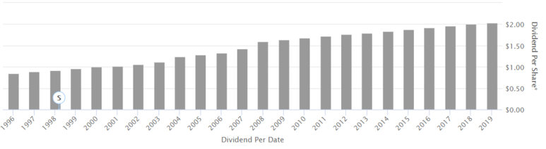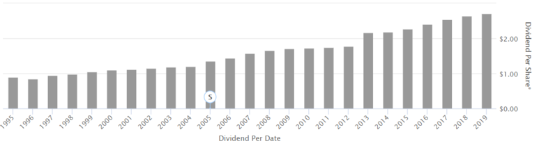 기존 0.233달러에서 소폭 상승되었다. 그리고 24년 동안 배당금을 증가시켜 왔다. 1년만 더 배당금을 지속적으로 증가시키면 배당귀족주에 이름을 올리게 된다. 배당귀족주란 25년 이상 배당금을 증가시켜온 기업 붙여주는 호칭으로 정말 쉽지 않다.