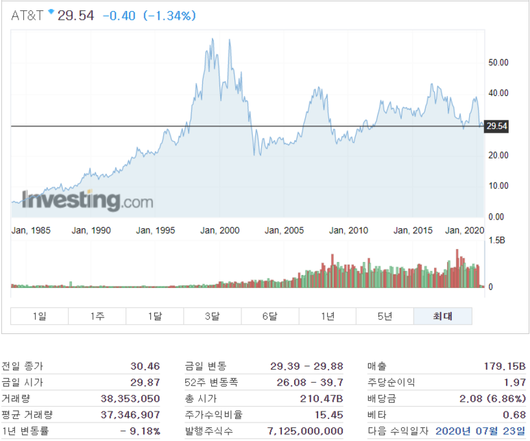 AT&T는 버라이즌(Verizon, VZ)과 함께 미국 최대의 통신사이다. 이 기업 역시 한국에서 미국 주식에 투자하는 사람들에게 잘 알려져 있다. 아마도 고배당률인 것이 크게 작용하고 있지 않나 생각한다. 버라이즌도 4% 이상의 고배당률이지만 AT&T는 대략 7%를 육박한다.