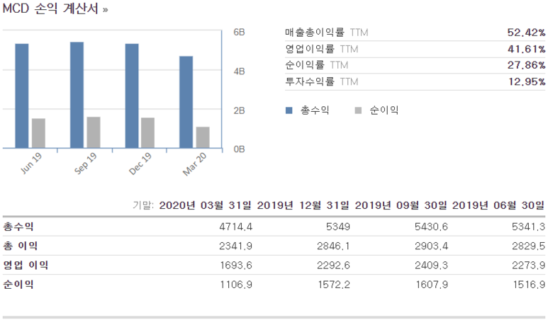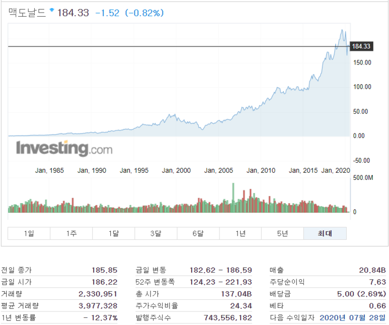 43년째 배당금이 상승 중이다. 쉽게 꺾일 것 같진 않다. 인스턴트식품에 대해 어느 정도 예전만큼의 신뢰도는 아니지만 내가 가본 맥도날드는 항상 사람들로 붐볐다. 어딜 가나 맥도날드에 있는 사람들은 다음에도 방문할 것이고 또 방문할 것이다. 고객의 충성도가 상당히 높은 상태이기 때문에 충분한 고객 확보가 되어 있다고도 볼 수 있다. 매수할 때 고려하고 있는 내용이다.