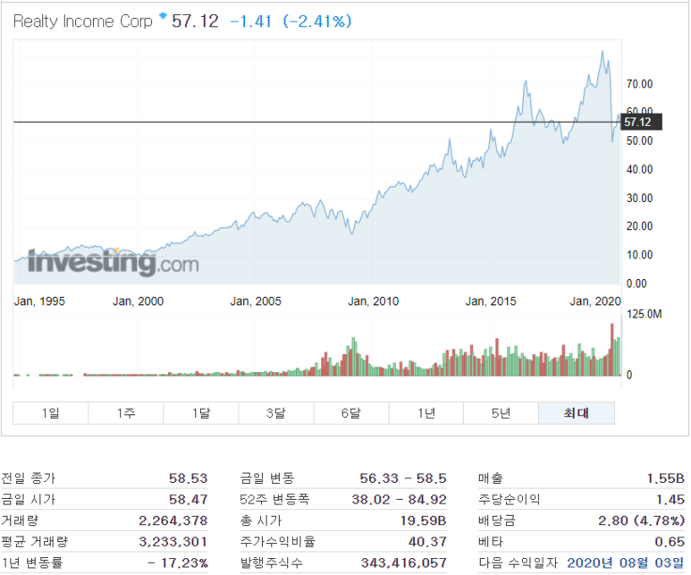 리얼티인컴은 미국 주식에 투자를 하는 사람들에게 월배당을 하는 기업으로 잘 알려져 있다. 안정적인 포트폴리오로 현재까지 엄청난 성장을 하고 있다. 실적이면 실적, 주가면 주가, 배당금이면 배당금까지 뭐 하나 나무랄 곳이 없는 기업이다.