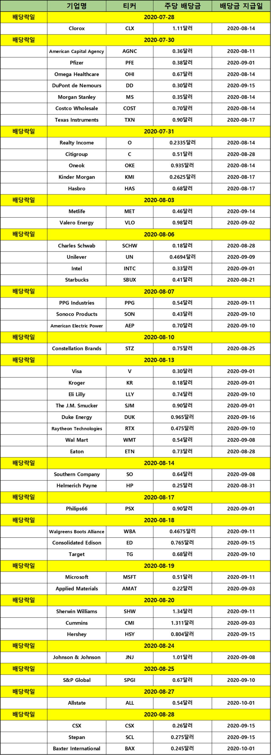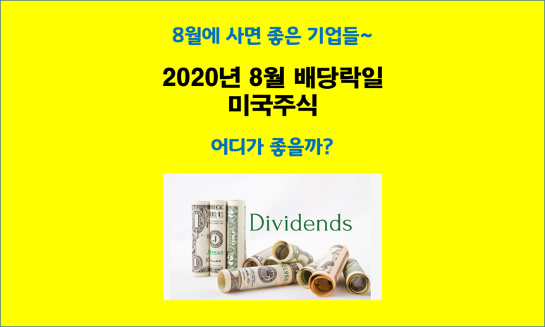 오늘은 8월에 배당락일인 기업들을 알아보려고 해요. 우리나라와는 다르게 분기 배당금을 지급하는 기업들이 많은 미국 주식을 찾아보았습니다. 정말 많은 기업들이 분기 배당금을 지급해요.