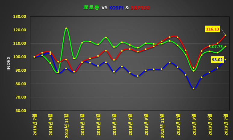 저번 달 103.18이었던 지수가 107.73으로 약 4.5%가량 상승했습니다. S&P500을 아직 넘어서지 못하네요. 하지만 코스피보다는 많이 앞서고 있어요.