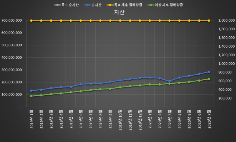 다음은 마지막으로 제가 생각하는 은퇴를 위한 목표 순자산과 목표 월배당금을 그래프로 나타내 보았어요.