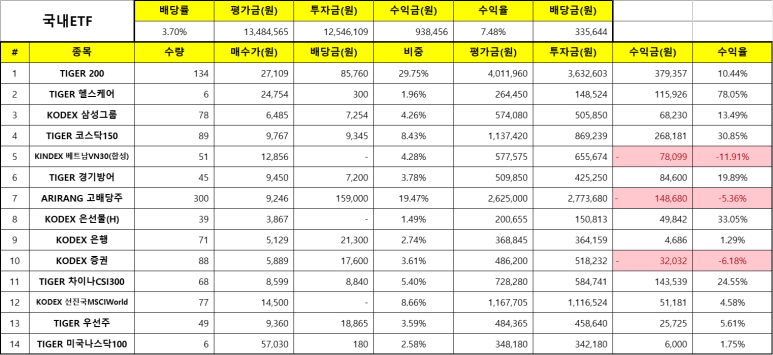 국내ETF 포트폴리오는 1,500만 원을 향해 순항 중입니다. 오히려 국내주식 포트폴리오보다 훨씬 수익률이 잘 나오네요. 붉은 건 딱 3개뿐인데 확실히 규모가 작으면 수익률이 아무 의미가 없는 듯합니다. ㅋㅋ