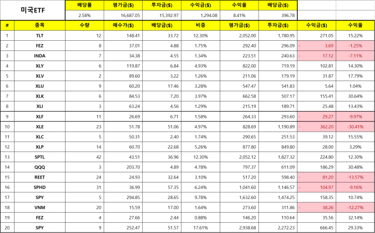 어느덧 미국ETF 포트폴리오도 20,000달러를 향해 달려가네요. 꾸준한 매수는 포트폴리오의 규모를 큼직큼직하게 만들어 준다고 생각해요. 매달 담을 때는 크게 느끼지 못하는데 매달 정리할 때 그걸 잘 느낄 수 있습니다.