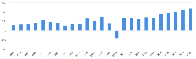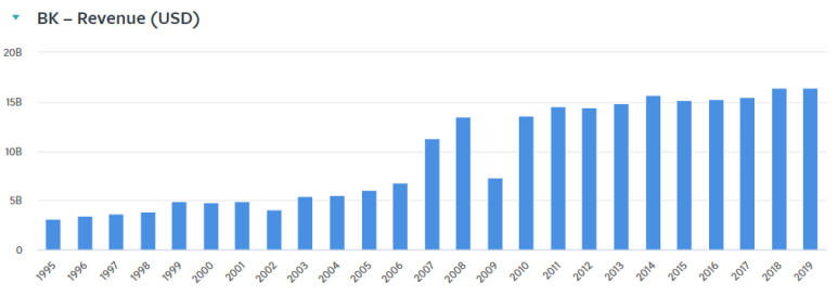 뱅크 오브 뉴욕 멜론의 매출은 2009년 금융위기를 제외하고는 대체로 꾸준하게 증가하고 있어요. 매출이나 영업이익이 큰 은행은 아니지만 일반적인 시중이 아니라 대부분의 수익이 수수료 사업으로 운영하고 있어서 위험성도 낮고 다른 은행과는 차별된 업무를 하기 때문에 충분히 메리트가 있는 은행입니다.