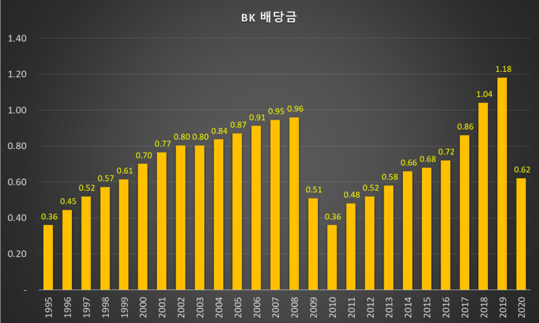 아래 배당금 히스토리를 보면 2008년 금융위기로 인한 배당금 삭감을 제외하곤 다시 배당금이 증가하고 있네요. 정상적으로 영업을 하는 기업의 경우 대부분 이러한 모습을 보여주죠.