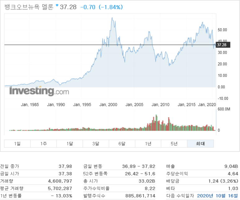 뱅크 오브 뉴욕 멜론뿐만 아니라 많은 은행들의 주가가 하락하고 반등을 하지 못하고 있습니다. 아무래도 실적이 악화되었기 때문이죠. 전 금융주를 좋아해서 월급이 들어오면 매수하려고 기다리고 있네요. 현재 금융주들의 주가가 상당히 매력 있다고 생각합니다.