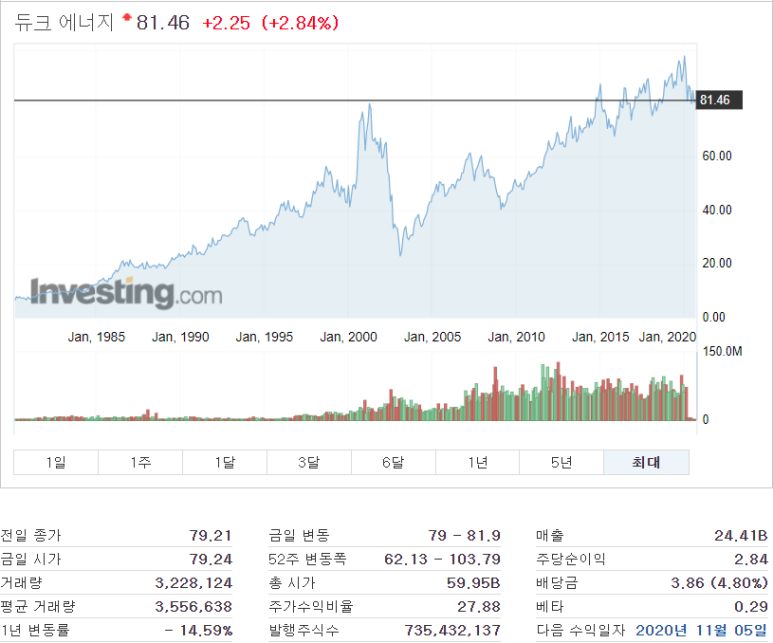 듀크에너지는 미국의 5개 주와 푸에르토 리코에 전기와 수도를 공급하는 유틸리티 회사로 1904년에 설립되었고 94년 연속 배당금을 지급해 오고 있어요. 유틸리티 회사의 장점은 안정적인 매출로 인한 꾸준한 배당금을 지급한다는 것이고 단점은 유지 보수가 많이 들고 원자재의 가격에 많이 영향을 받는다는 거예요.