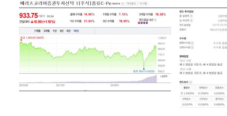 메리츠코리아증권1호[주식]C-Pe는 2015년에 설립되어 5년째 운용 중인 상품으로 환매수수료와 선취수수료는 없고 총보수는 연 1.043%입니다. 아직 5년 전의 주가에는 미치지 못했지만 저는 작년 12월 초에 시작해서 기준가 750원대에서부터 매달 자동으로 매수를 했지요. 그러다 보니 수익률이 약 15%를 거두고 있습니다.