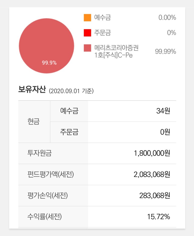 제가 현재 운용 중인 상품은 1가지예요. 바로 메리츠코리아증권1호[주식]C-Pe입니다. 연금펀드 전용이고요. 투자금액은 1,800,000원이고 평가금액은 2,083,068원이네요.