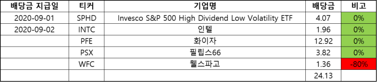 두 번째 배당금을 받아서 이 번달은 24.13달러를 벌었고요. 과연 9월 한 달간 얼마가 들어올지 벌써 기대가 되네요.