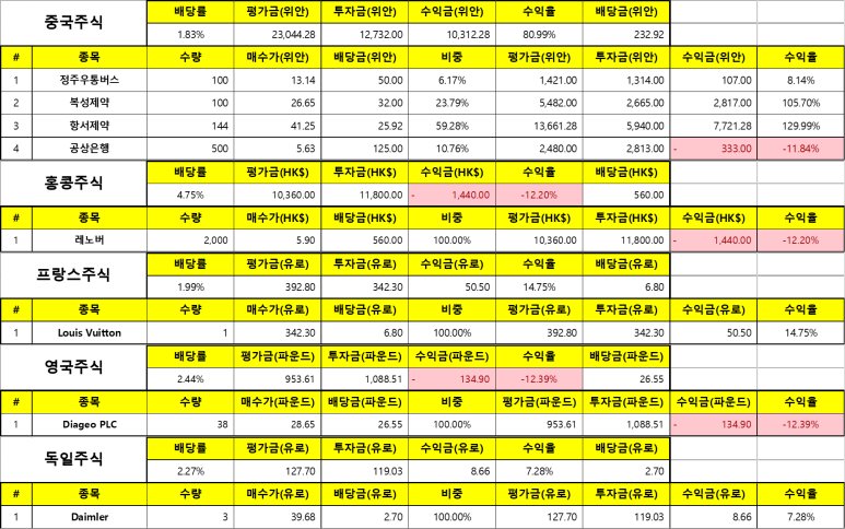 이 중에서 가장 큰 비중은 디아지오, 레노버, 항서제약입니다. 항서제약과 복성제약의 수익률이 엄청나네요. 요즘 더 담고 싶은 기업은 바로 프랑스의 로레알, 에르메스, 루이비통인데 워낙 주당 가격이 세서 쉽게 담질 못하고 있어요.