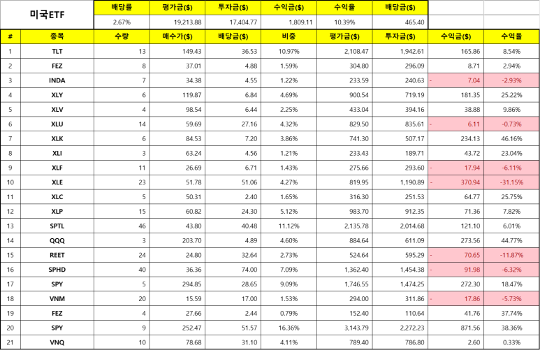 미국ETF : 평가금액 19,214달러, 수익금 1,809, 수익률 10.39%