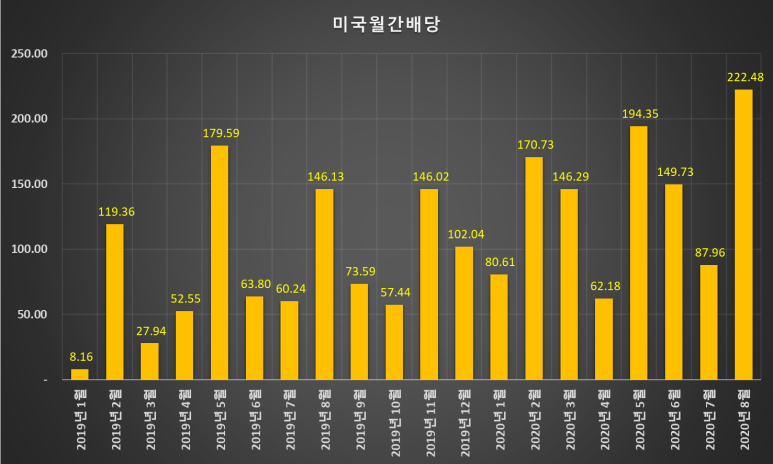 국내주식과는 다르게 월배당과 분기 배당이 활성화되어 있디 때문에 매달 배당금을 골고루 받을 수 있어 너무 좋아요. 확실히 우상향하는 모습을 볼 수 있어 재미가 있기도 해요. 월 200달러에 처음 터치하고 나니 최소한 200달러는 넘기고 싶어서 1월 4월 7월 10월에 배당금을 지급하는 기업을 찾아보고 있어요.
