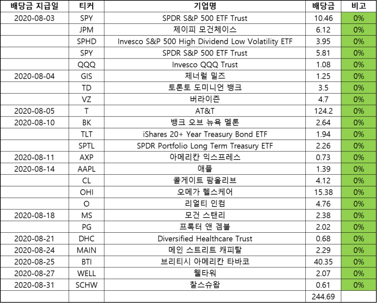 두둑한 8월의 배당금은 사람을 행복하게 해주네요. 그중에서도 AT&T 덕분에 200 달러를 넘겼어요. 한 달간 수령한 배당금 244.69달러로 역대 배당금 중 가장 많이 받았지요. 다양한 기업과 ETF로부터 받은 배당금은 모두 재투자에 활용되었고요.