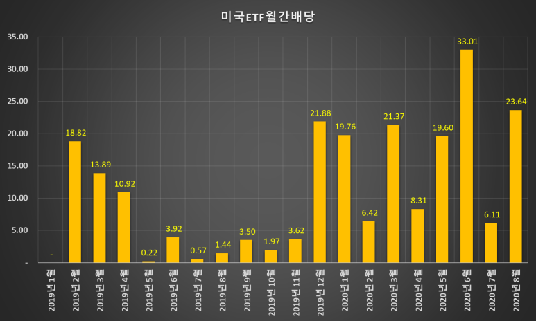 월 2만 원 정도 받는 시기가 왔어요. 미국ETF도 조금씩이나마 우상향하는 모습을 볼 수 있고 8월 한 달간은 23.54달러를 받아서 살짝 기분은 좋아요.