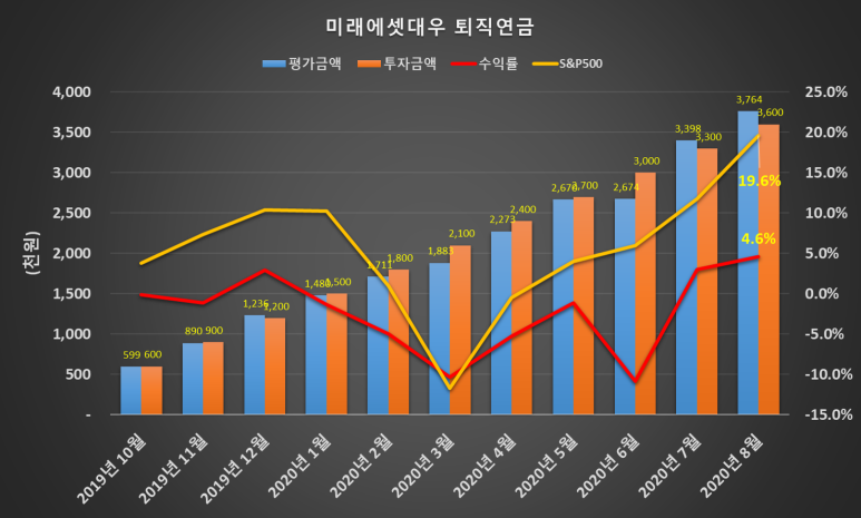 그리하여 8월까지 평가금액은 3,764,489원이고 투자금액은 3,600,000원입니다.