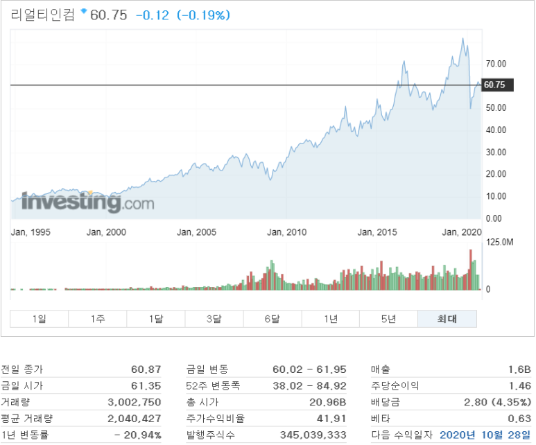 리얼티 인컴은 25년간 배당금을 증가시켜오고 있고 월배당금을 지급합니다. 그리고 그에 맞는 주가도 꾸준하게 우상향하고 있지요. 이런 리츠는 정말 좋은 것 같아요. 헬스케어 리츠보다 대부분 상업용 리츠이기 때문에 조금 더 안정적인 사업분야를 가지고 있기도 하고요.