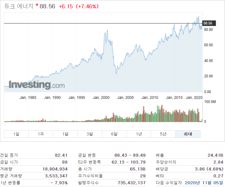 듀크 에너지는 미국의 전기 유틸리티로 우리나라의 한국전력과 같은 기업입니다. 직접 발전소를 운영하면서 전기를 생산하고 공급함으로써 매출을 올리는 기업이죠. 큰 성장은 없지만 꾸준하게 매출을 올리고 장기적인 성장을 이룰 수 있는 기업이기 때문에 안정적인 주가 수익과 배당 수익을 얻기 좋은 기업이기도 합니다.