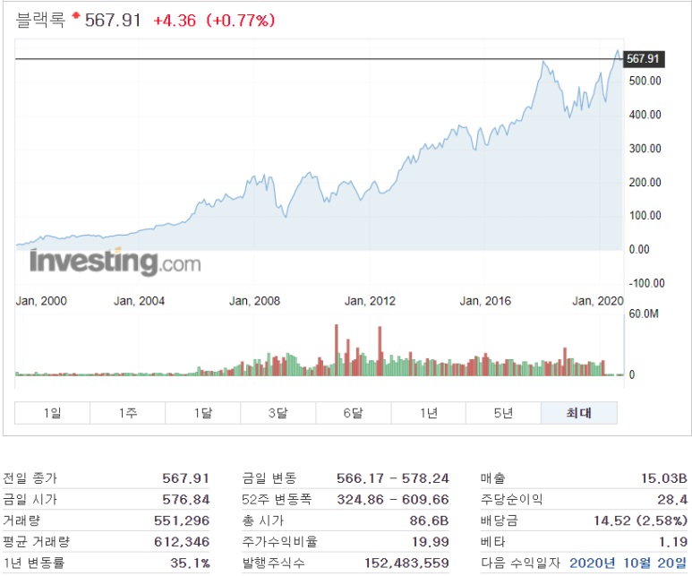 블랙락의 최근 주가는 567.91달러로 볼 때마다 고점이 아닐 때가 없었어요. 항상 고점에 있는 블랙락의 주가는 과연 합당한가에 대해 간단히 이야기를 나눠 볼게요.