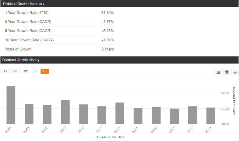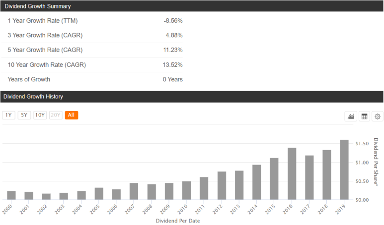 10년간 약 13.5%의 배당금 증가율을 보여주고 있고요. 2017년에 무슨 일이 있었는지 한 번 하락 후 다시 증가하고 있습니다.
