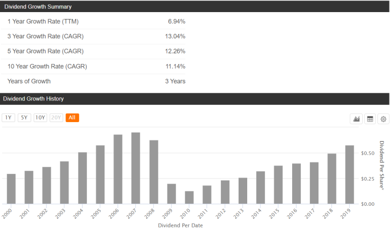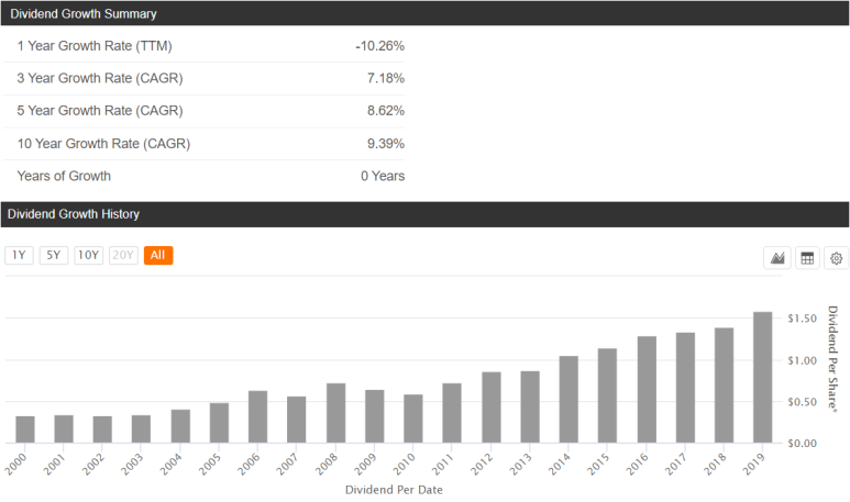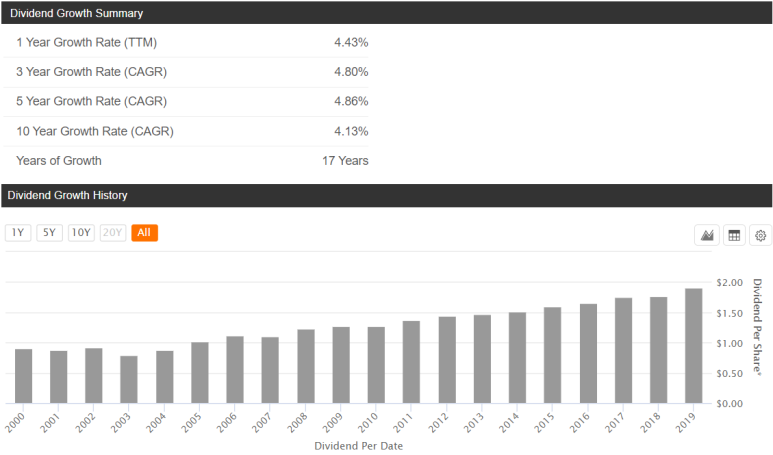 10년간 배당금 상승률은 약 9% 정도 되고요. 배당금 상승 기록은 없지만 20년 동안 꾸준하게 증가하는 모습을 확인할 수 있네요.