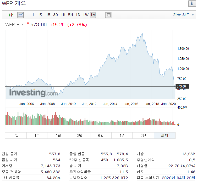 WPP는 영국에서 설립되어 1985년 광고업을 시작했으며 세계에서 가장 큰 매출을 올리는 대형 광고회사입니다.