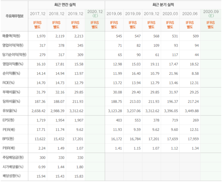 매출은 소소하지만 매년 증가하고 있고 재무제표가 예쁜 기업이지요. 영업이익률, 순이익률, ROE도 좋게 나오고 부채비율도 낮은 편이고 유동성도 좋고요. 배당금도 실적의 15%를 맞춰서 배당하는 것을 보면 참 믿음이 갑니다. 대주주의 횡포 같은 건 없는 것 같고요. 기부도 잘하고 실적도 꾸준한 것을 보면 대주주와 경영자의 마인드도 좋은 기업이라고 생각합니다.