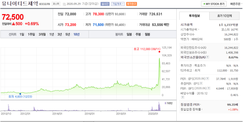 매수했던 가격대는 저런 뾰족한 모양이 없을 때였으니 그다지 인기도 없던 기업 중 하나였어요. 그 당시 시가총액은 3천억 이하였고요. 하지만 지금은 시가총액이 1조 천억이네요. 최근에 발표한 약이 잘 되면 시가총액은 유지가 되겠지만 그렇지 않다면 다시 내려가겠죠. 시장은 냉정하니까요.