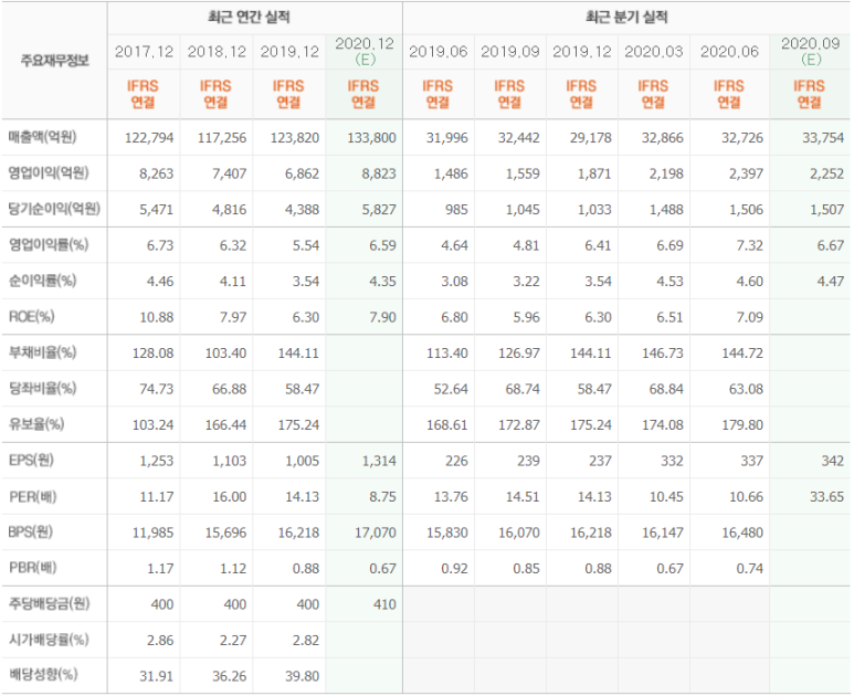 2019년 기준 13조 4천억원의 매출과 8천8백억원의 영업이익을 올렸어요. 부채율은 높고 당좌비율은 낮지만 워낙 통신회사라는 비즈니스 모델이 좋고 경제적해자가 있다고 판단되어 매수하게 되었습니다.