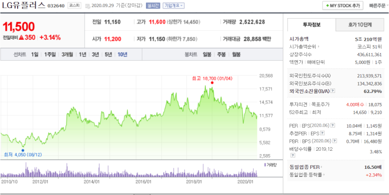 - 시가총액 5조원의 통신회사로 3사(SK텔레콤, KT & LG유플러스) 중 3위를 차지한 기업이에요. 매년 꾸준한 실적을 내주는 LG의 알짜 기업 중 하나이기도 합니다.