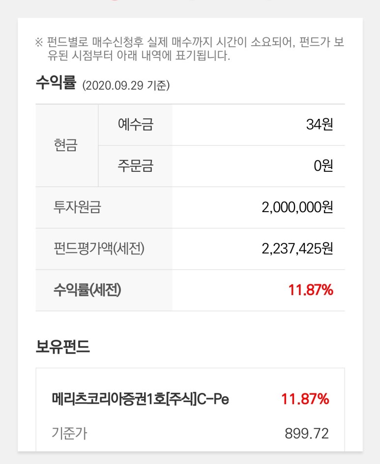 보유 중인 상품은 단 하나의 펀드입니다. 메리츠코리아증권1호[주식]C-Pe로만 구성되어 있는 제 포트폴리오는 아주 심플하게 돼있어요. 가장 관리하기 편한 계좌이기도 해요. 매달 자동으로 입금과 매수가 되기 때문이에요.
