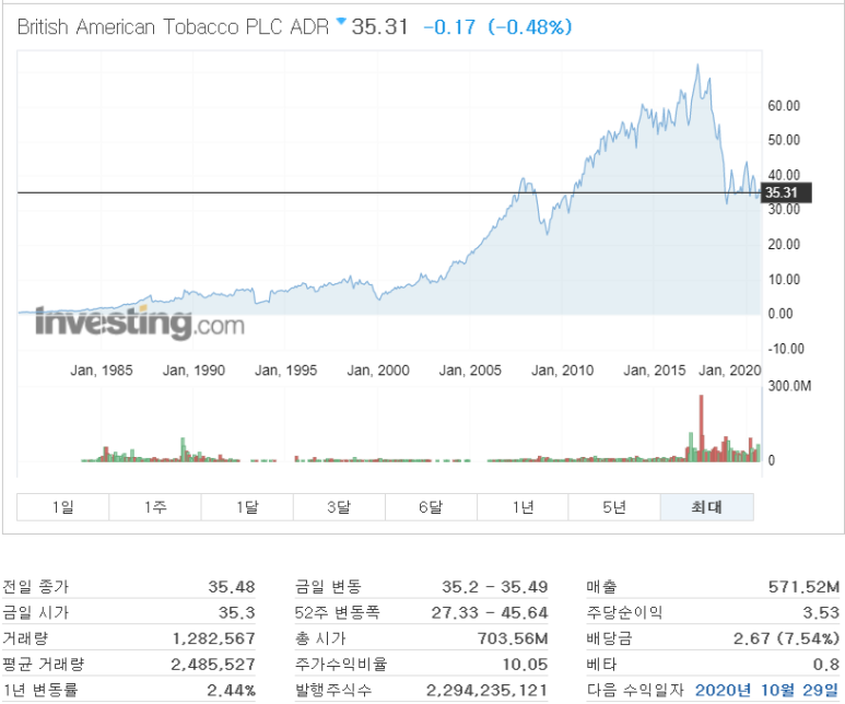 - 2019년 기준 영업이익이 90.16억 파운드를 달성할 만큼 엄청난 규모를 가진 담배 회사로 경기를 잘 타지 않는 장점도 있어요. 하지만 주가가 많이 빠져서 주주들도 걱정하고 있지만 그동안 배당금을 합치면 웬만해서 오래 들고 가면 적자 나기는 힘들죠. 오히려 하락한 이때가 주을 기회라고 생각해서 계속 매수하고 있습니다.