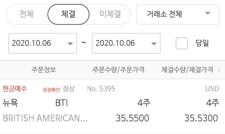 10월 5일에 이어 6일에도 주식을 매수해 보았어요. 매수한 종목은 브리티시 아메리칸 타바코입니다. 실제로 미국 회사는 아니고 영국 회사입니다. 단지 미국에 상장되어 있는 것으로 제가 매수한 것일 뿐이지요. 브리티시 아메리칸 타바코, 필립모리스, 알트리아, KT&G 등등 담배 회사가 유명해요. 제가 좋아하는 기업이기도 합니다. 기본적으로 마진율이 큰 장사이기 때문에 배당금을 잘 주고 실적도 무난하게 나오니까요. 그래서 4주를 매수하게 되었어요.