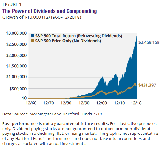 S&P500 지수를 1960년부터 2018년까지 58년치를 보시면 배당없이 투자를 했다면 1만 달러는 43만 달러 정도 되었고 배당금을 받아서 재투자했다면 245만 달러가 되지요..각각 4,300% 와 24,500%로 6배나 차이나 나는 신기한 모습을 보실 수 있죠.