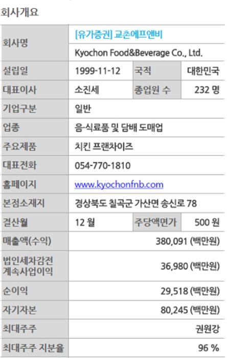교촌에프엔비는 1999년에 설립되어 현재 22년 차입니다. 종업원 232명의 중소기업이지요. 정말 맛있는 치킨이에요.