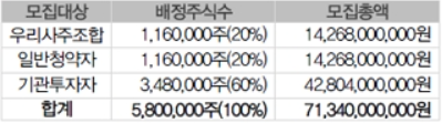 총 배정 주식은 5,8000,000주이고 모집총액은 713.4억입니다. 만약 시초가가 공모가의 5배로 보면 시가총액은 3,567억이 되는데 순이익 대비 12배, 자기자본 대비 4.5배가 됩니다. 충분히 합당한 가격대라고 보는데 이 이상이라면 리스크가 있다고 봐요. 물론 저의 생각입니다. ㅎㅎ