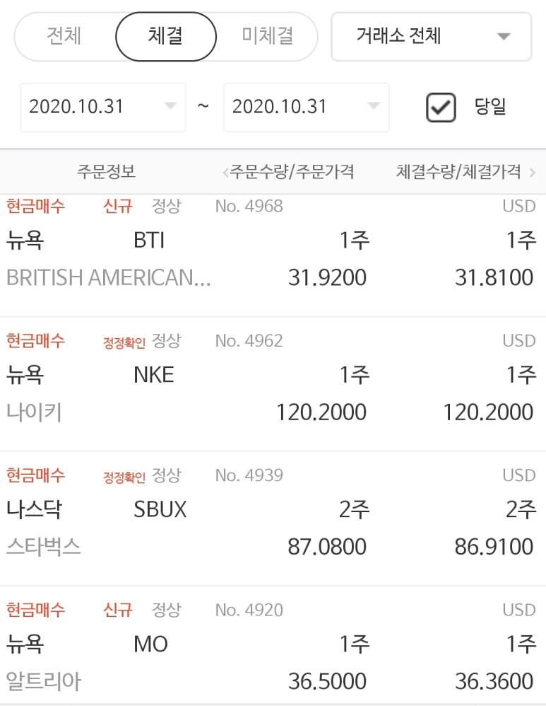 10월 31일 마지막 10월은 미국 주식을 소량 매수하면서 마감을 하게 되었습니다. 휴가 때문인지 돈을 많이 써서 매수가 조금 부실했던 한 달이었네요. 이번에 매수한 주식은 브리티시 아메리칸 타바코(BTI), 나이키(NKE), 스타벅스(SBUX), 알트리아(MO)입니다. 담배 회사의 주식을 정말 자주 담는 것 같아요. 그 이유는 물론 저렴하다는 것이 주된 이유였고요. 나이키와 스타벅스는 떨어지면 사야겠다고 기다리면 절대 오지 않고 스트레스만 받을 수 있어서 그냥 담았지요. 근데 사고 나면 정말 잘 떨어집니다. 저만의 능력인가요? 헤헷.