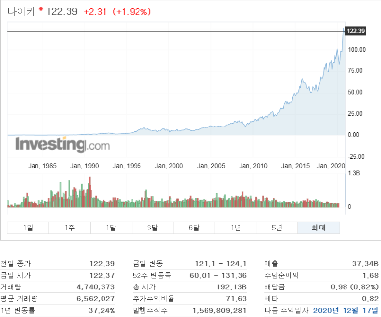 - 독일의 아디다스와 함께 가장 대중적인 스포츠 용품을 만들어 파는 회사로 명품 브랜드를 제외한 의류 및 잡화 쪽에서는 최고의 기업이라고 생각해요. 그런 인기만큼 주가도 잘 안 떨어지는 모습을 볼 수 있습니다. 떨이 지길 바라고 기다리면 점점 주가가 올라가는 모습을 볼 수 있기 때문에 가급적 그냥 사는 것이 맘고생을 안 하는 방법이 될 수 있지요.