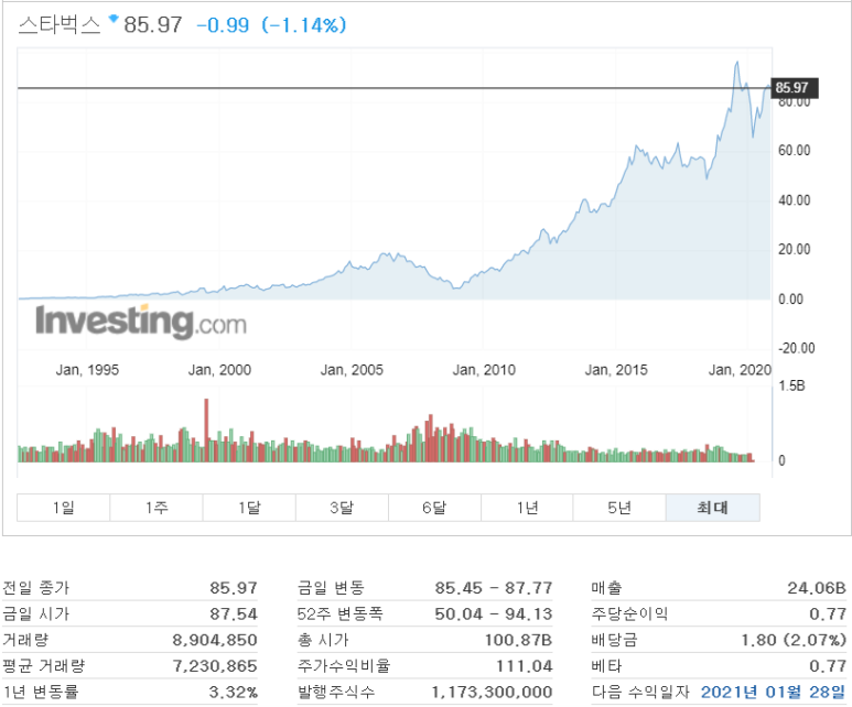 3. 스타벅스(SBUX) - 미국 커피 프랜차이즈, 시가총액 1,008,7억 달러, 시가 배당률 2.07%, 분기 배당