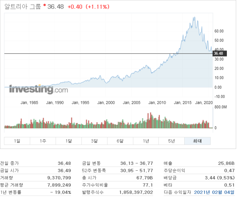 - 점점 떨어지는 주가를 보면서 두 가지의 생각이 들어요. 첫 번째는 기업의 재정 문제이고 두 번째는 전 세계의 금연 문화로 인하여 판매량이 줄어서 알트리아의 주가가 하락하는 것이에요. 과연 답이 무엇일지는 모르겠지만 제가 해외를 나가보면 담배가 과연 세상에서 사라질까?라는 의문을 가지게 돼요. 수많은 사람들이 피는 이 담배는 절대 사라지지 않을 것이라는 결론이 답이지 않나 싶어요. 즉, 담배 회사는 앞으로도 돈 잘 버는 기업으로 남아 있겠죠.