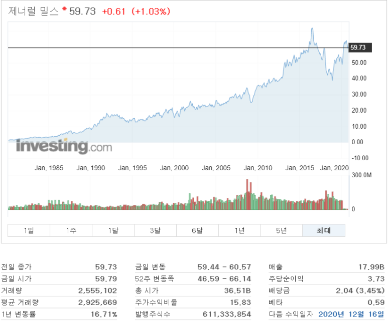 제너럴 밀즈는 주가도 꾸준하게 상승해 왔고 현재 주가도 비싸지 않아요. 그리고 배당금은 0.49달러에서 0.51달러로 증가되었습니다. 식품 회사의 안정적 사업구조와 배당급 지급은 저 같은 투자자에겐 정말 좋은 투자 포인트지요. 과도한 성장을 기대하고 베팅하는 건 저에게 의미가 없네요.