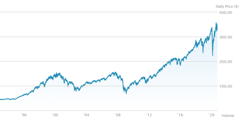 SPY의 주가는 2000년부터 2008년까지 횡보하는 모습을 하다가 2009년 리만브라더스 파산 이후부터 현재까지 엄청난 속도로 성장하고 있습니다. 아마도 애플, 마이크로소프트, 아마존, 구글과 같은 기업들의 미친 성장과 함께 S&P500도 성장해 왔지요. 이런 미국 시장의 성장으로 인해 국내에도 많은 개인 투자자들이 미국 시장으로 눈을 돌리기 시작해서 아직도 인기가 많은 시장이기도 합니다.