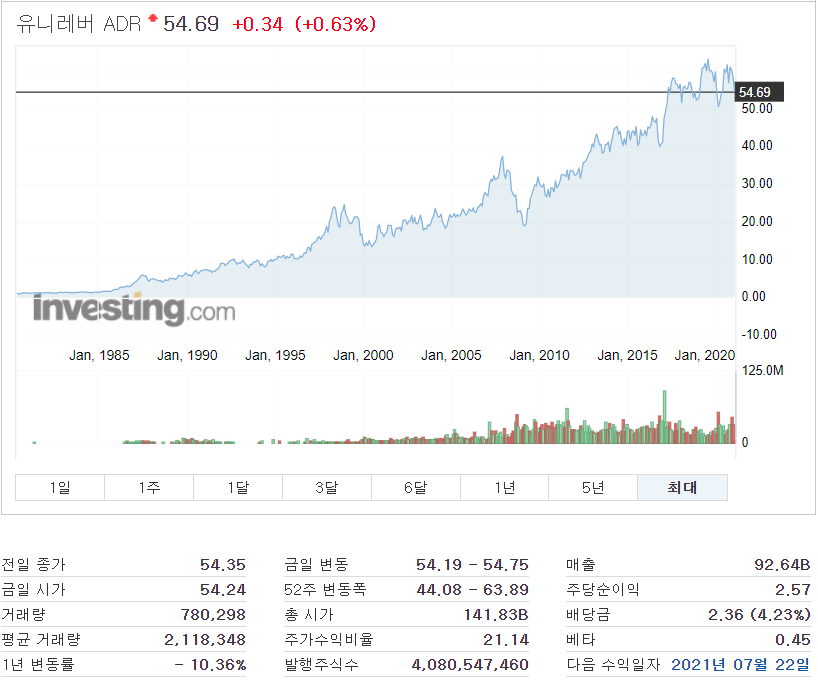 유니레버도 50달러 대에서 흐지부지한 모습을 보여주고 있어서 제가 볼 땐 아주 좋은 매수 기회이지 않나 싶어요. 주가가 주춤주춤할 때 비중을 늘린다면 추후에 수익률에 많은 기여를 하겠지요. 시가 배당률은 프록터 앤 겜블 보다 높은 4.23%로 아주 훌륭하지요? 거기다가 PER도 21배로 많이 비싼 편이 아니고요.